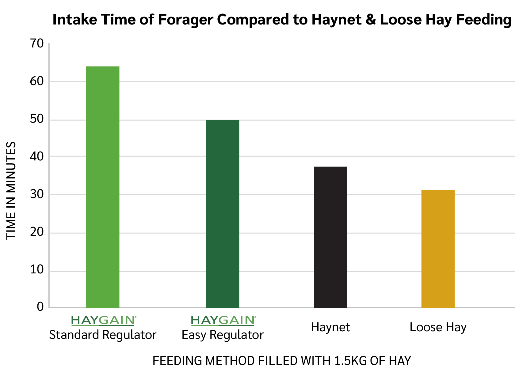The design of The Forager Regulators ensures small bites of forage are taken on each mouthful. Compared to loose hay, The Forager can significantly increase the feeding time. See chart below for the comparison research.